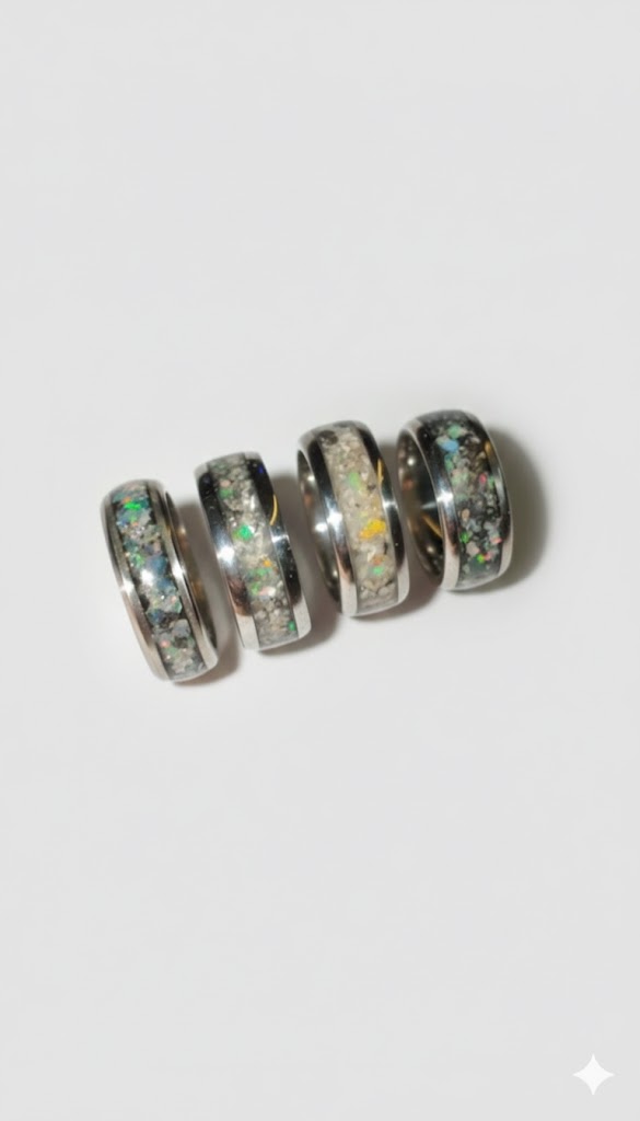 Using high-quality bases of Stainless Steel, Sterling Silver, or the unique, layered patterns of Damascus Steel, I handcraft each ring to your specific wishes. The heart of these pieces is often formed by vibrant Opal, known for its mesmerizing play of light. This can be delicately combined with the ashes of a loved one or a dear pet.